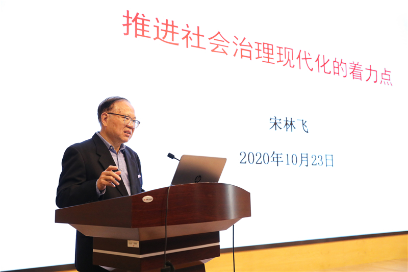揭牌后,宋林飞作《推进社会治理现代化的四个着力点》的专题报告。参与揭牌仪式的各级领导和常州市级机关事务管理部门、各市辖区及溧阳市机关事务管理部门的同志现场聆听了报告。报告从党的十九届四中全会所提出的推进国家治理体系和治理能力现代化出发,指出社会治理体系是“党委领导、政府负责、民主协商、社会协同、公众参与、法治保障、科技支撑”。在此基础上,报告提出推进社会治理现代化的四个着力点:一,推进市域社会治理现代化;二,增强社会治理现代化的科技支撑;三,提高新媒体环境下社会治理能力;四,及时预警预防社会风险。宋林飞结合自己的学术成果、自身参与社会治理的经验和典型社会案例,深入浅出地阐述了推进社会治理现代化的四个着力点,获得了全体参会人员的一致认可与高度肯定。