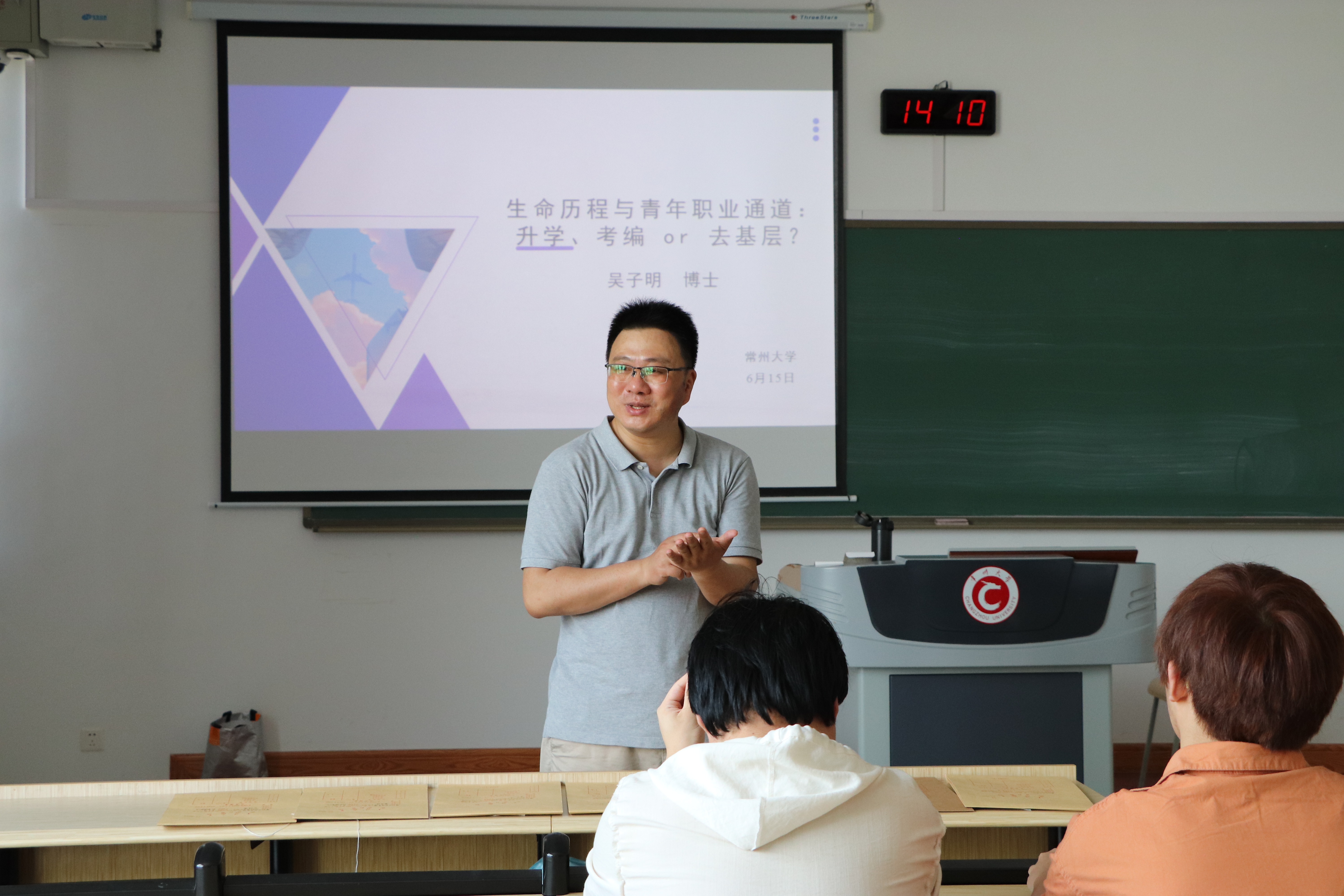 2022年6月15日,av直播 、苏南现代化研究院青年学者论坛第10期在西太湖校区立德楼X226举行,av直播 社会工作系吴子明博士作了“生命历程理论视角下的大学生职业生涯规划”的专题讲座。社工专业19级、20级和21级部分学生参加了讲座。