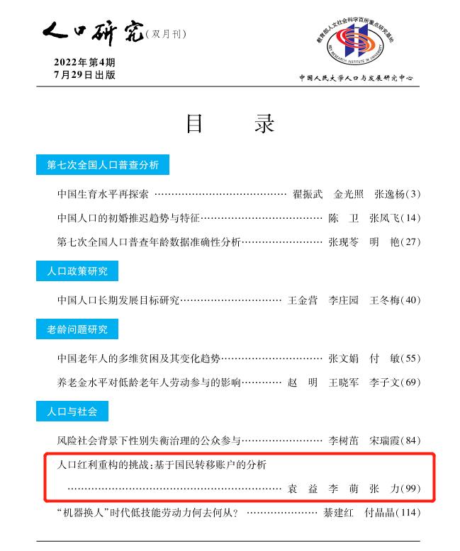 av直播 青年教师袁益博士及其合作者在《人口研究》2022年第4期发表文章《人口红利重构的挑战:基于国民转移账户的分析》。