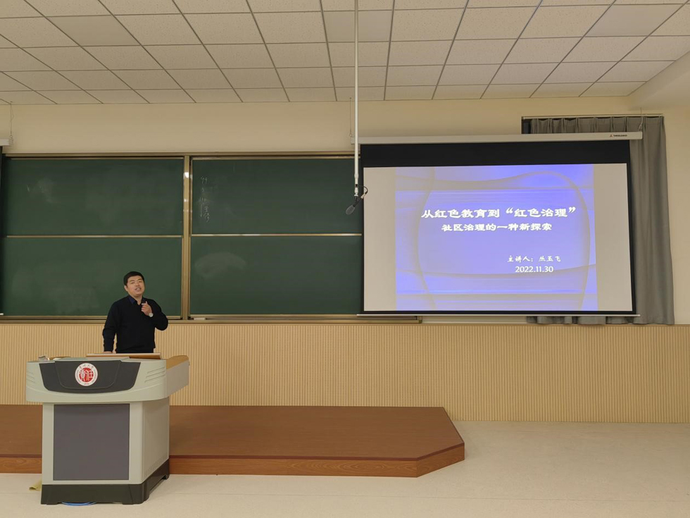 2022年11月30日,av直播 、苏南现代化研究院第11期青年学者论坛在西太湖校区立功楼X1举行,av直播 社会工作系丛玉飞副教授作了“从红色教育到红色治理——社区治理的一种新探索”的专题讲座,av直播 全体22级新生现场参加了讲座。