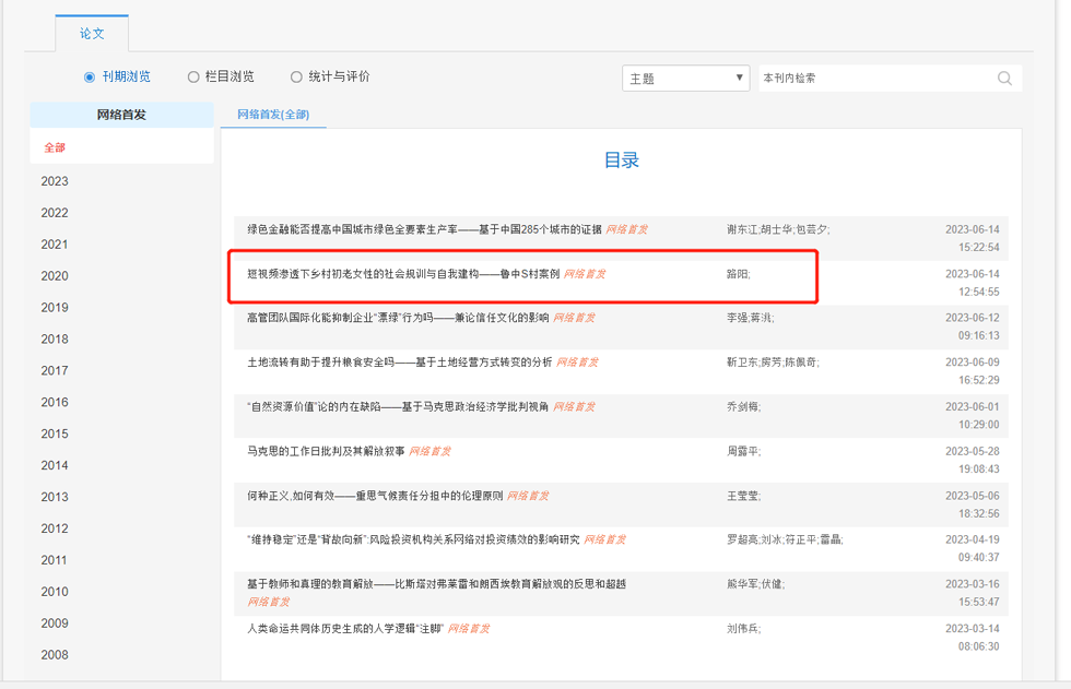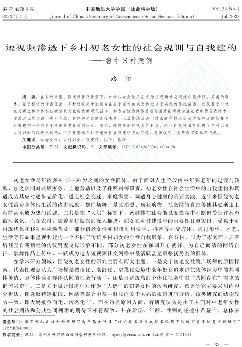 av直播 青年教师路阳博士在《中国地质大学学报(社会科学版)》2023年第4期发表文章《短视频渗透下乡村初老女性的社会规训与自我建构——鲁中S村案例》(网络首发)。