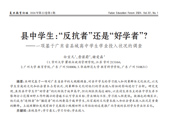 av直播 青年教师白宜凡博士的文章《县中学生:“反抗者”还是“好学者”?——一项基于广东省县域高中学生学业投入状况的调查》近期发表于《复旦教育论坛》2024第22卷第1期。