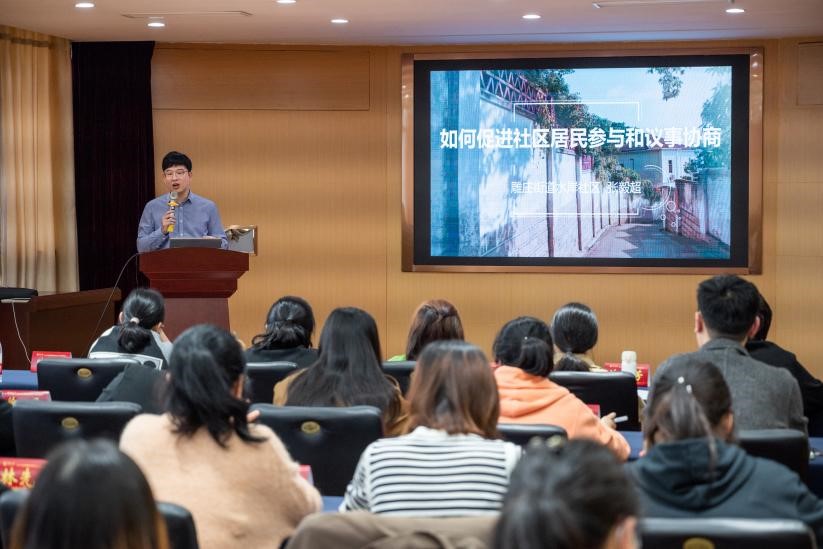 张毅超书记以“如何促进社区居民参与和议事协商”为主题,结合自身工作经验与体会,指出要从“人从哪里来、事情从哪里来和钱从哪里来”三个维度来考虑如何将旁观者转化成行动者,以抓关键少数、以共同目标设计有意义的活动和以效益为核心的方式方法来提高企业单位、居民群众参与度。其次,张书记用三个动员案例,生动形象地描述如何在社区开展形式多样的活动,来提升群体的认同感与归属感,激发参与热情。最后,他通过介绍雕庄模式下的和谐议事,以流动小板凳工作法解民忧暖民心,强调了社区需要做到动员社区居民参与治理与调解多方矛盾。