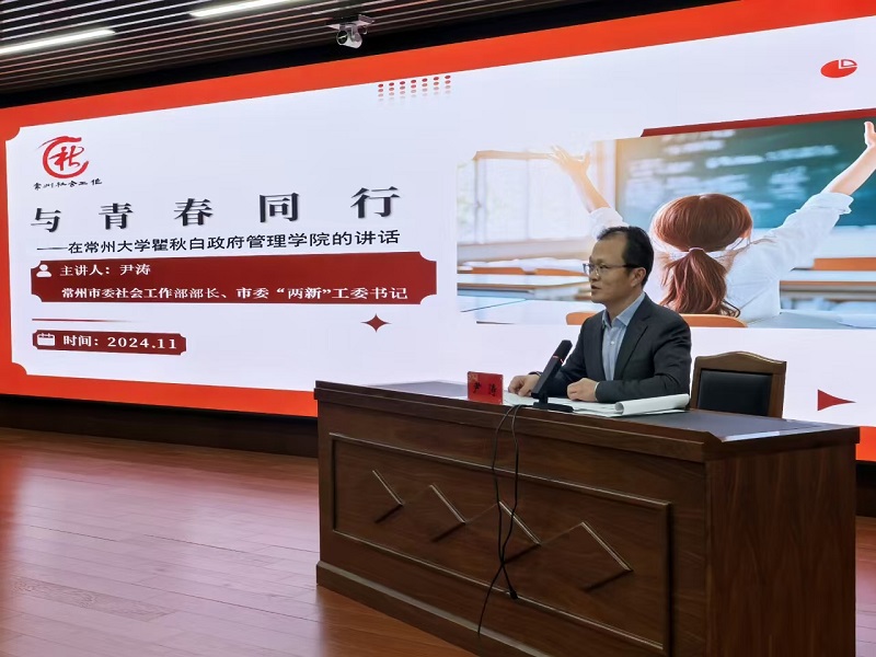 尹涛部长在“社会工作思政夜谈”活动环节为社会工作学生授课。他从“城、产、人”三个维度讲述了常州是一个美好的城市,通过“可为、愿为、乐为”三个角度阐述了社会工作人才的美好未来。尹涛勉励同学们要以远大志向激发“想为”干劲,明确目标、找准方向;以真才实学提升“善为”本领,勤学善思、发展自我;以崇高信念涵养“甘为”情怀,答好国家之问、世界之问、人民之问、时代之问,收获开阔人生。