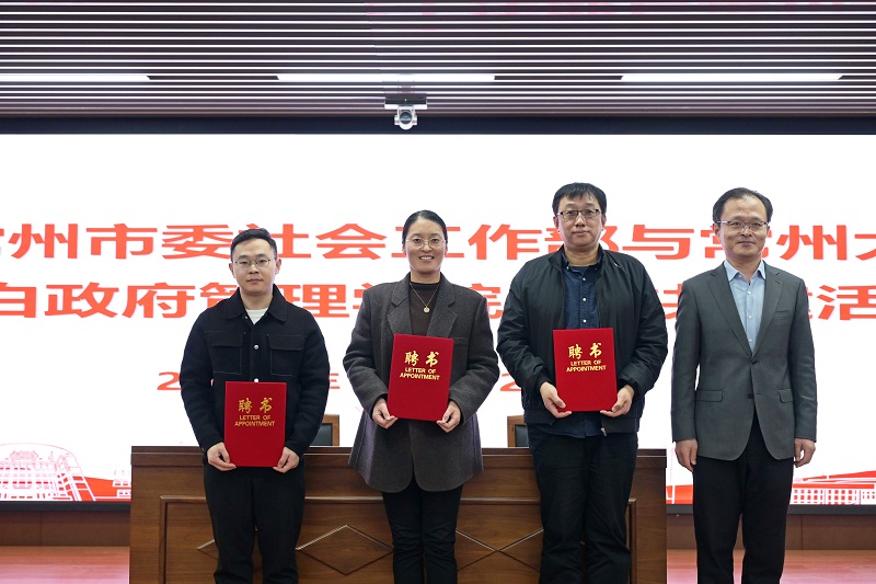 宋林飞院长为吴春华、沈伟伟、王元元三位基层社工代表颁发了大学生校外实践指导老师聘书。尹涛部长为翟进、刘玉兰、钱志远三位老师颁发了常州市社会工作发展研究智库专家聘书。