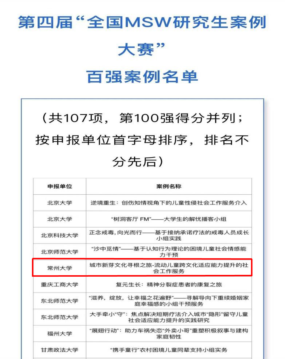 据悉,第四届“全国MSW研究生案例大赛”自2024年10月启动以来,经过三轮审核,共有来自全国168家MSW培养单位的422篇案例进入通讯评审。大赛按照“同一个参赛案例需经其他区域1位教指委专家、1位高校专家、1位行业专家评审”要求和《第四届“全国MSW研究生案例大赛”初赛评分细则》,对参赛队伍提交的案例进行了匿名评选。根据综合评分结果,评选出了百强案例,最终共有69所MSW研究生培养单位的107项案例入选(第100强得分并列),代表了我国MSW研究生案例撰写的最高水平。(通讯员/李晴 审核/徐高明 编辑/徐丽)