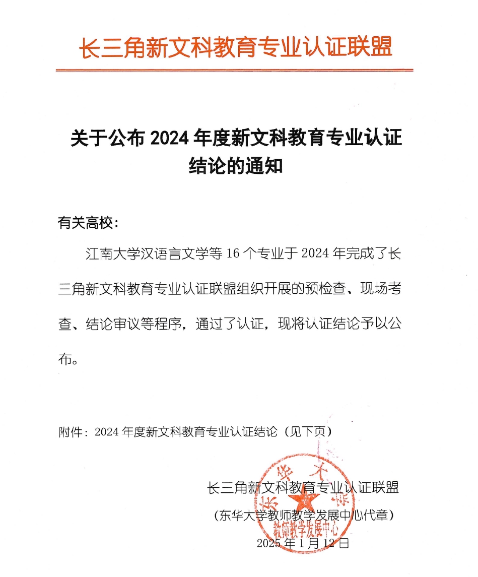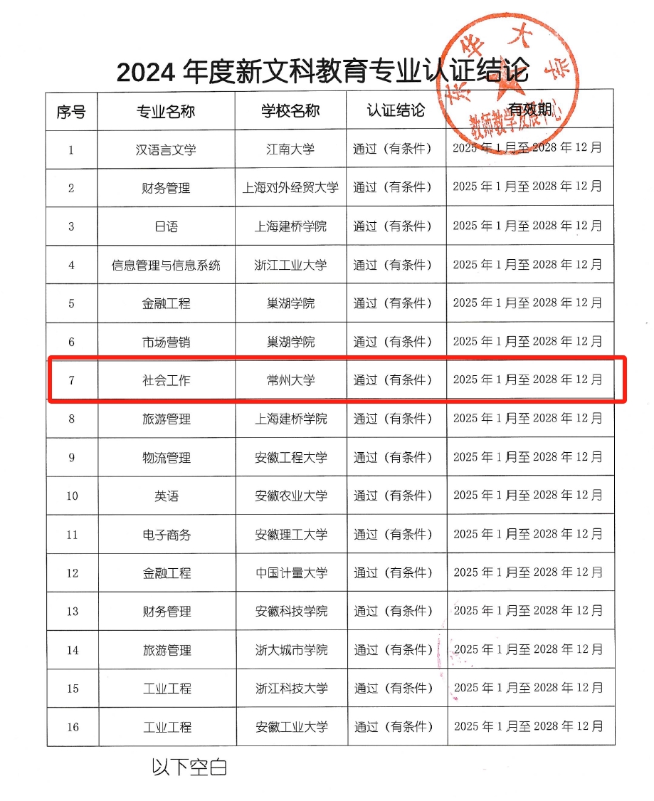近日,长三角新文科教育专业认证联盟发布《关于公布2024年度新文科教育专业认证结论的通知》。av直播 社会工作专业正式通过2024年度新文科教育专业认证,有效期自2025年1月至2028年12月。是江苏省内第一个通过长三角新文科教育专业认证的社会工作专业。