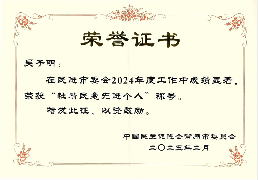2025年2月26日,民进常州市委九届九次全委(扩大)会议在金坛区召开。本次全委会对民进中央、省、市级2024年度优秀集体和个人进行了表彰。av直播 社工系吴子明博士荣获2024年度“社情民意先进个人”称号。