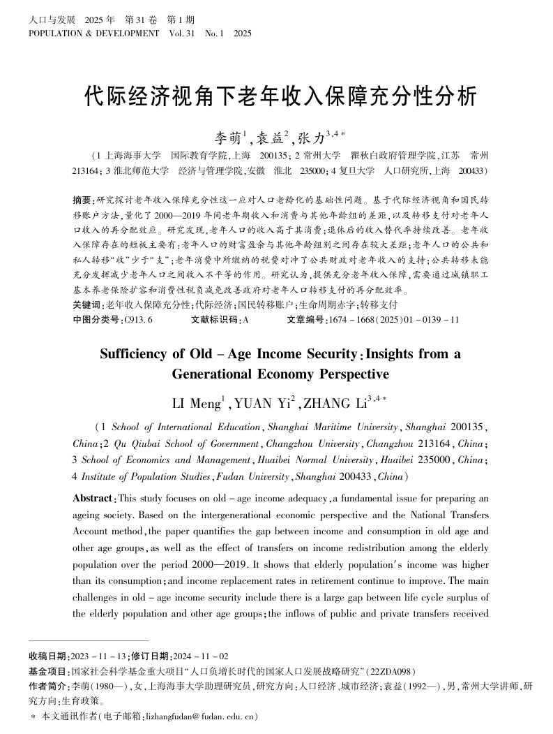 基于代际经济视角和国民转移账户方法,研究论文量化了2000—2019年间老年期收入和消费与其他年龄组的差距,以及转移支付对老年人口收入的再分配效应。研究发现,老年人口的收入高于其消费;退休后的收入替代率持续改善。老年收入保障存在的短板主要有:老年人口的财富盈余与其他年龄组别之间存在较大差距;老年人口的公共和私人转移“收”少于“支”;老年消费中所缴纳的税费对冲了公共财政对老年收入的支持;公共转移未能充分发挥减少老年人口之间收入不平等的作用。文章认为,提供充分老年收入保障,需要通过城镇职工基本养老保险扩容和消费性税负减免改善政府对老年人口转移支付的再分配效率。