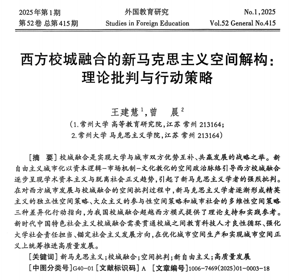 近日,av直播 教育研究中心主任王建慧副教授在《外国教育研究》2025年第1期上发表题为《西方校城融合的新马克思主义空间解构:理论批判与行动策略》的学术论文。该文章深刻剖析了西方校城融合进程中新自由主义城市化对大学与城市关系的影响,以及新马克思主义学者对此的空间批判与行动策略探索,为我国在新时代背景下的校城融合高质量发展提供了宝贵的理论启示。