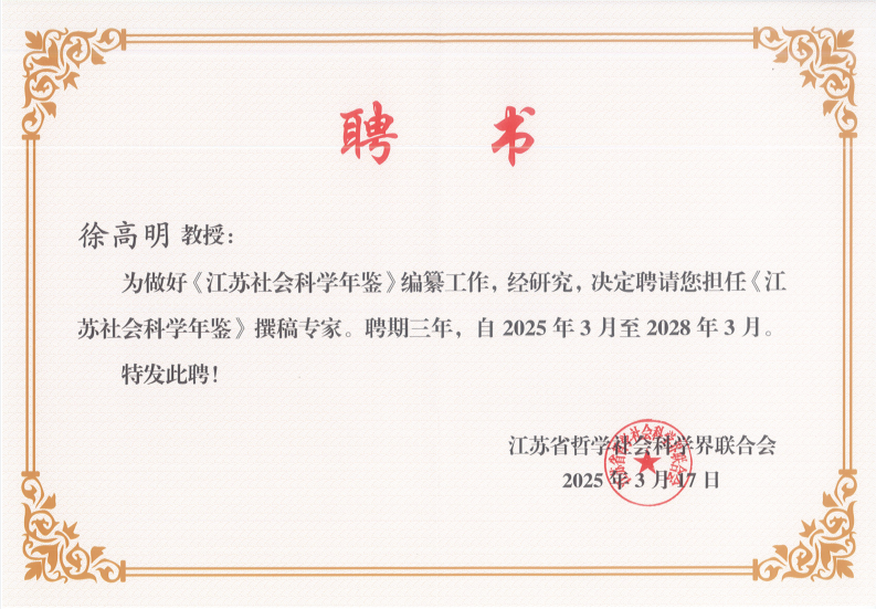 近日,《江苏社会科学年鉴(2024)》编纂工作研讨会暨年鉴撰稿专家聘任仪式在南京举行。av直播 av直播 徐高明教授受邀参会,并被江苏省哲学社会科学界联合会正式聘任为年鉴撰稿专家,聘期三年。