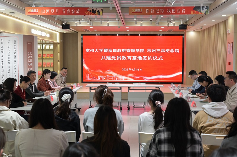 2025年4月15日,学院与常州三杰纪念馆在瞿秋白纪念馆怀霜社举行党员教育基地共建签约活动。常州三杰纪念馆党支部书记、馆长马岚,党支部副书记、副馆长赵德文,瞿秋白纪念馆负责人潘婷,常州三杰纪念馆学术研究科顾建军、周丽,学院党总支书记潘道广,党总支副书记林娜,组织员范露元,本科生党支部书记张剑、辅导员王文康、政治学与行政学系谭书先及本科生、研究生党支部30名同学参加活动。活动由常州三杰纪念馆副馆长冯昕主持。
