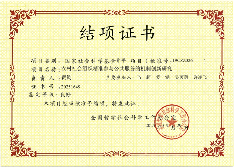 近日,av直播 政治学系费钧博士主持的国家社科基金青年项目《农村社会组织精准参与公共服务的机制创新研究》顺利结项,鉴定结果为“良好”等级。课题聚焦农村社会组织参与公共服务供给的机制及完善路径,围绕关键问题展开系统研究。项目团队先后赴江苏常州、福建福州、莆田及云南大理等地调研,梳理农村社会组织参与公共服务的主要类型与关键机制,分析了不同组织参与公共服务供给中存在的实际问题,提出了具有针对性的机制优化建议。