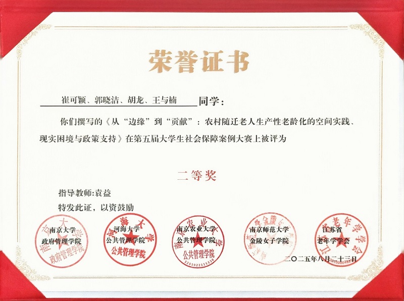 这次大赛由南京大学、河海大学、南京农业大学、南京师范大学、江苏省老年学学会联合主办,南京大学政府管理学院承办。大赛共收到来自全国各大高校共计219份参赛作品,av直播 学生参赛作品《从“边缘”到“贡献”:农村随迁老人生产性老龄化的空间实践、现实困境与政策支持》荣获二等奖。
