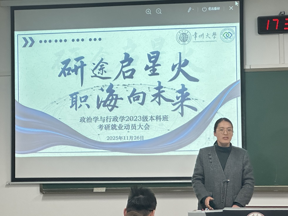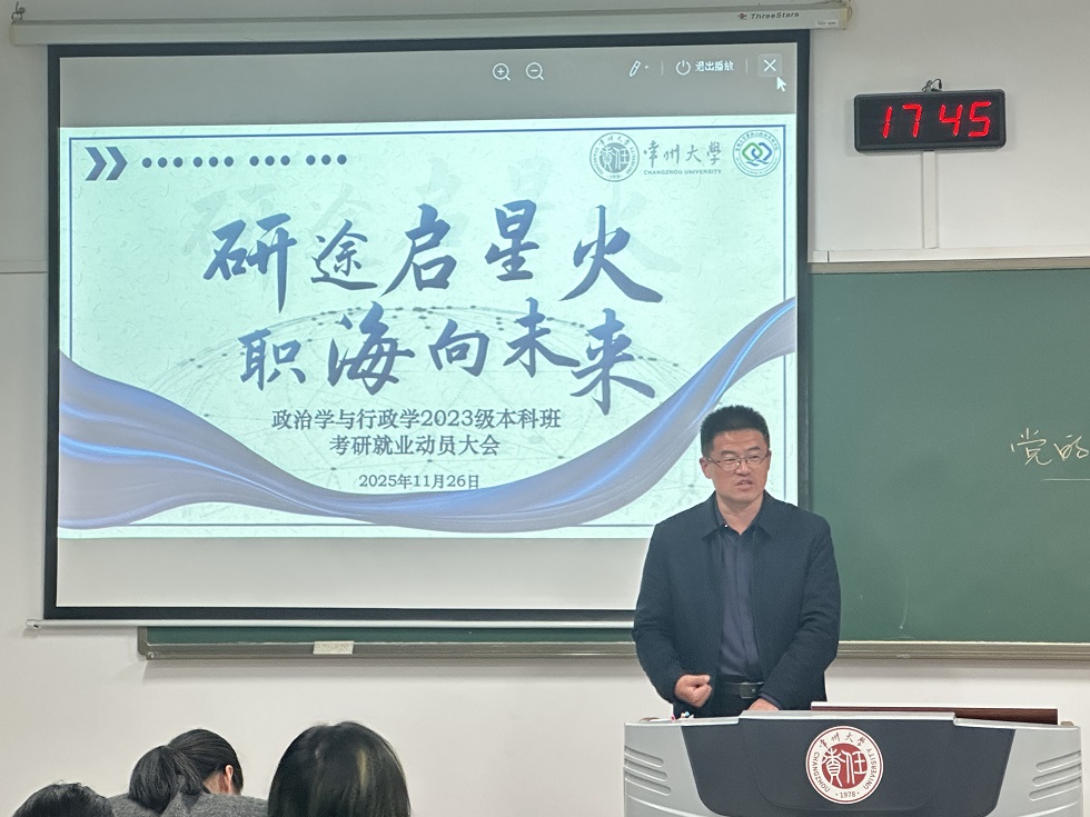 为助力学生做好学业生涯规划,明确考研与就业的方向,11月26日下午,学院在立德楼219教室举办了以“研途启星火,职海向未来”为主题的考研就业动员会,院党委书记潘道广、副书记林娜出席会议,政治学系副主任邵义,政治学系教师马薇、黄璋、谭书先,公管系教师路阳,班主任王彩霞,辅导员张剑和23级政行专业全体学生参加会议。动员会由邵义主持。
