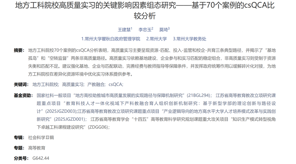 论文《地方工科院校高质量实习的关键影响因素组态研究——基于70个案例的csQCA比较分析》发表于《高等工程教育研究》2026年第2期。研究以70个地方工科院校实习案例为样本,运用清晰集定性比较分析(csQCA)方法,识别出高质量实习形成的三条典型路径:资源—匹配型、投入—监管型和校企—共育型,并揭示了“基地孤岛”和“空转监督”两类非高质量路径。研究表明,高质量实习依赖于基地建设、企业参与与实习匹配之间的稳定组合,而资源配置失衡与匹配不足则是制约实习质量提升的重要因素。论文提出,应强化实习基地建设、提升企业深度参与水平、优化实习岗位匹配机制,同时完善经费保障与教师指导制度,并发挥政府在资源统筹与平台建设中的引导作用,以缓解校企对接碎片化问题,为地方工科院校在差异化资源环境下优化实习实践体系提供参考。